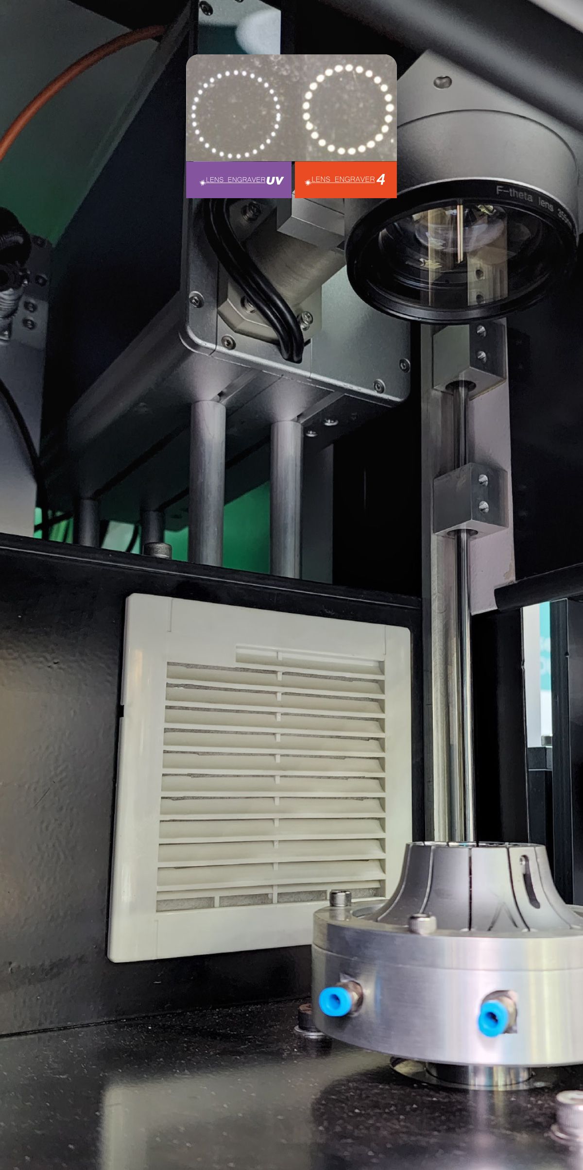 Máquina de gravação a laser para lentes oftálmicas de última geração, o LENS ENGRAVER AT-AT UV possui uma gravação mais aprimorada com micro pontos, formas geométricas e logotipos complexos.